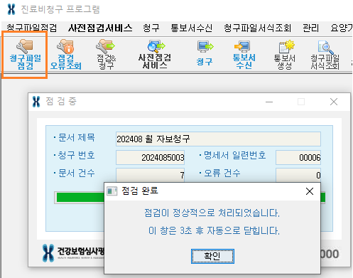 5.진료비청구 프로그램에서 청구파일점검을 클릭해 점검을 진행해 주시기 바랍니다.