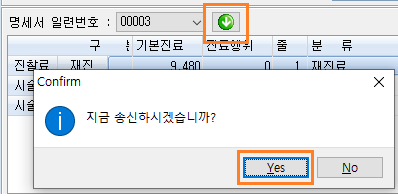 2.명세서 일련번호를 선택하고 옆의 연두색 화살표 아이콘인 해당 명일련 파일생성 버튼을 클릭해 주시기 바랍니다. 지금 송신하시겠습니까? 메시지가 나오면 Yes버튼을 눌러 송신해 주시기 바랍니다.